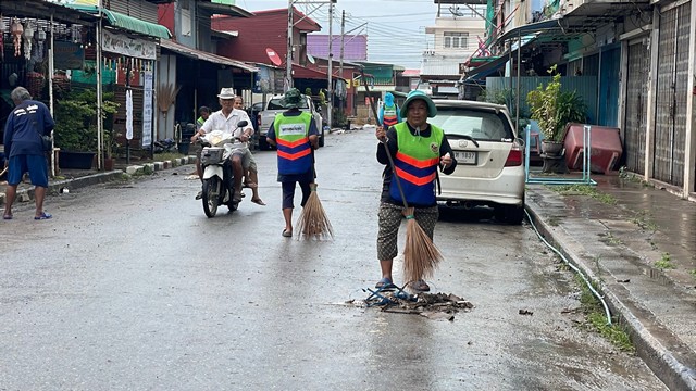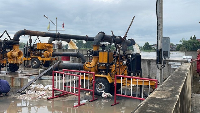 ขณะที่เจ้าหน้าที่เทศบาลตำบลป่าโมก ดำเนินการทำความสะอาดผิวจราจร เนื่องจากมีเศษขยะที่ไหลมากับน้ำจำนวนมากตลอดทั้งคืนที่ผ่านมา เทศบาลตำบลป่าโมก ตั้งเครื่องสูบน้ำช่วยสูบระบายน้ำที่ท่วมขังในตัวตลาดป่าโมก ออกสู่แม่น้ำเจ้าพระยา ได้สำเร็จ