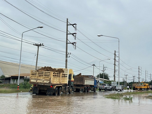 อ่างทอง- รถบรรทุกทราย ลำเลียงเข้าจุดกรอกถุงบิ๊กแบ็ก เร่งอุดรอยรั่วบริเวณสะพานป่าโมก