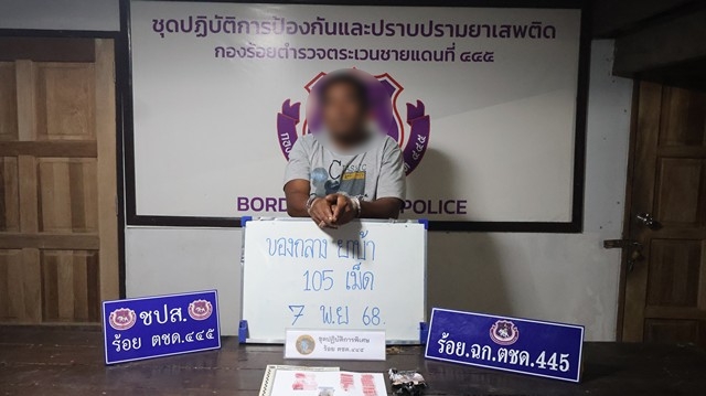 เจ้าหน้าที่เดินทางไปถึง พบนายสามารถ (นามสมมุติ) อายุ 41 ปี ยืนอยู่ที่โรงจอดรถ เมื่อเห็นเจ้าหน้าที่ก็มีการตกใจ ท่าทางมีพิรุด เจ้าหน้าที่จึงแสดงตัวขอตรวจค้น พบยาบ้า 19 ถุง โดยแบ่งใส่ถุงพลาสติก มีทั้งแบบถุงละ 1 เม็ด 2 เม็ด 5 เม็ด และ 10 เม็ด รวมยาบ้าทั้งหมด 105 เม็ด อยู่ในถุงยาเส้นซุกซ่อนอยู่ภายในโรงจอดรถ เจ้าหน้าที่ยังพบยาบ้าที่แตกเป็นผงอีกจำนวน 2 ถุง น้ำหนักรวม 4.67 กรัม พันด้วยเทปพันสายไฟสีดำ ซุกซ่อนอยู่ใต้เบาะรถบรรทุกไม้ฝั่งคนขับ เจ้าหน้าที่จึงตัวมาทำบันทึกจับกุมและทำการตรวจปัสสาวะ ที่กองร้อย ตชด.445