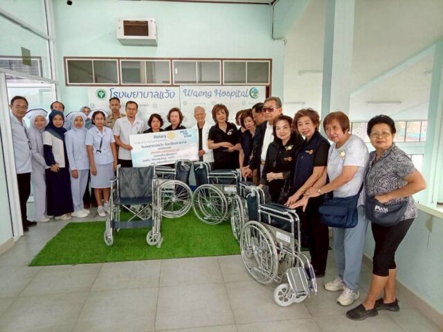 โดยในครั้งนี้ทาง สโมสรโรตารี่สัมพันธวงศ์ นำโดย นย.มยุรี พิพัฒน์กุลสวัสดิ์ นายกสโมสรโรตารีสัมพันธวงศ์ พร้อมคณะ และ ผู้ช่วยผู้ว่าการภาค สุพรรณี ประทีปเวฬุริยะ มอบอุปกรณ์ทางการแพทย์ให้กับผู้อำนวยการโรงพยาบาลอำเภอแว้ง จังหวัดนราธิวาส โดยครั้งนี้ทาง ว่าที่ร้อยตรี. ธนิตศักดิ์ ดารามั่น ได้กล่าวเพิ่มเติมว่าตนเองมาในฐานะอดีตนายกสโมสรโรตารี่พญาไท และตัวแทนสโมสรโรตารี่พญาไท ภาค 3350 ในครั้งนี้ได้รับฟัง สภาพการปฏิบัติหน้าที่ของบุคลากรทางการแพทย์แล้วรู้สึกเห็นใจเป็นอย่างยิ่ง ประกอบกับอัตรากำลังซึ่งยังขาดอยู่หลายอัตรากำลังรวมถึงอาคารสถานที่ซึ่งไม่เพียงพอต่อการรองรับผู้ป่วยในแต่ละวัน โดยทางโรงพยาบาลยังทำหน้าที่ในการบำบัด ผู้ติดยาเสพติดให้โทษ ที่มาเข้าโครงการอีกเป็นจำนวนมากนี่ก็เป็นอีกปัญหาหนึ่งของใน 3 จังหวัดชายแดนภาคใต้