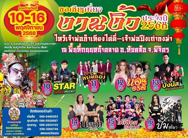 สำหรับการจัดงานงิ้วของชาวตลาดทับคล้อที่มีขึ้นระหว่งวันที่ 10-16 พ.ย. 2568 ในเย็นวันที่ 14 พ.ย. 68 จะมีการแสดงของสิงโต-มังกร ที่บริเวณหน้าศาลเจ้าทับคล้อ ส่วนการจัดงานในยามค่ำคืนก็มีงิ้วและมหรสพต่างๆ รวมถึงคารวานสินค้าของกิน-ของใช้ ผลิตภัณฑ์ OTOP ของดีของ จ.พิจิตร ให้นักท่องเที่ยวได้เลือกซื้อเลือกชิม ช้อป แชะ และใช้สิทธิคนละครึ่งกับร้านค้าที่เข้าร่วมโครงการกระตุ้นเศรษฐกิจตามวัตถุประสงค์ของรัฐบาลดังกล่าวอีกด้วย