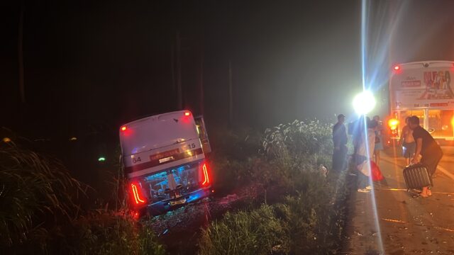 ที่เกิดเหตุพบรถทัวร์โดยสารประจำทางสายกรุงเทพฯ–ระนอง หมายเลขทะเบียน 16-1063 กรุงเทพมหานคร สภาพตกลงไปข้างทางริมร่องน้ำขนาดใหญ่ มีผู้โดยสารทั้งหมด 24 คน แบ่งเป็นผู้โดยสาร 21 คน คนขับและพนักงานต้อนรับอีก 3 คน ตรวจสอบไม่มีผู้โดยสารได้รับบาดเจ็บ เจ้าหน้าที่ได้ช่วยเหลือและนำขึ้นจากรถเพื่อรอรถคันใหม่มารับไปยังจังหวัดระนองต่อไป