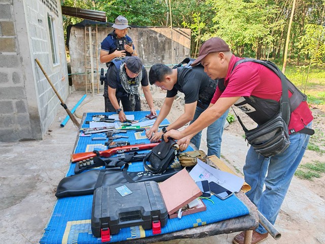 พร้อมของกลางยาบ้า 510 เม็ด, อาวุธปืนลูกซองยาวยี่ห้อ COMMANDO 1 กระบอก, ปืนยาวขนาด .22 จำนวน 1 กระบอก, ปืนพกสั้นแบบไทยประดิษฐ์ใช้กับกระสุนขนาด 9 มม. 1 กระบอก, ปืนพกสั้นแบบไทยประดิษฐ์ใช้กับกระสุนขนาด .380 มม. 1 กระบอก, ปืนลูกซองไทยประดิษฐ์ใช้กับกระสุนลูกซองขนาดเบอร์ 12 จำนวน 1 กระบอก, ซองบรรจุกระสุนขนาด 9 มม. 1 อัน, ซองบรรจุกระสุนขนาด .22 จำนวน 1 อัน, กระสุนลูกซองเบอร์ 12 จำนวน 15 นัด, กระสุนขนาด 5.56 จำนวน 10 นัด, กระสุนปืนขนาด .22 จำนวน 5 นัด,กระสุนปืนขนาด .25 จำนวน 8 นัด, กระสุนปืนขนาด .38 จำนวน 2 นัด, และกระสุนปืนขนาด 9 มม.อีกจำนวน 10 นัด