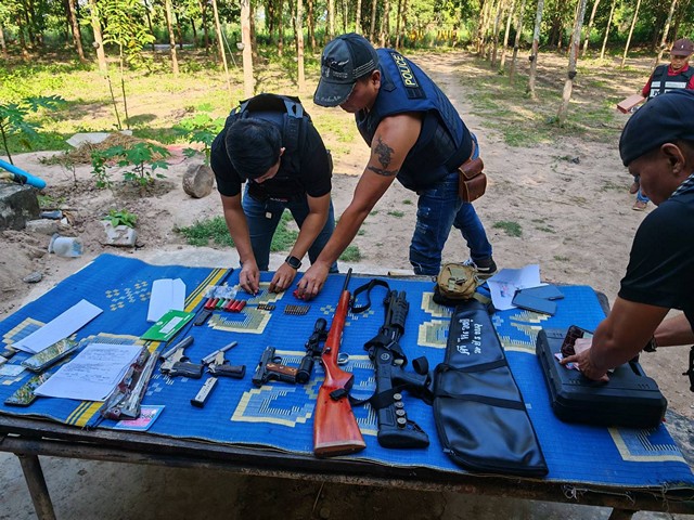 พร้อมของกลางยาบ้า 510 เม็ด, อาวุธปืนลูกซองยาวยี่ห้อ COMMANDO 1 กระบอก, ปืนยาวขนาด .22 จำนวน 1 กระบอก, ปืนพกสั้นแบบไทยประดิษฐ์ใช้กับกระสุนขนาด 9 มม. 1 กระบอก, ปืนพกสั้นแบบไทยประดิษฐ์ใช้กับกระสุนขนาด .380 มม. 1 กระบอก, ปืนลูกซองไทยประดิษฐ์ใช้กับกระสุนลูกซองขนาดเบอร์ 12 จำนวน 1 กระบอก, ซองบรรจุกระสุนขนาด 9 มม. 1 อัน, ซองบรรจุกระสุนขนาด .22 จำนวน 1 อัน, กระสุนลูกซองเบอร์ 12 จำนวน 15 นัด, กระสุนขนาด 5.56 จำนวน 10 นัด, กระสุนปืนขนาด .22 จำนวน 5 นัด,กระสุนปืนขนาด .25 จำนวน 8 นัด, กระสุนปืนขนาด .38 จำนวน 2 นัด, และกระสุนปืนขนาด 9 มม.อีกจำนวน 10 นัด