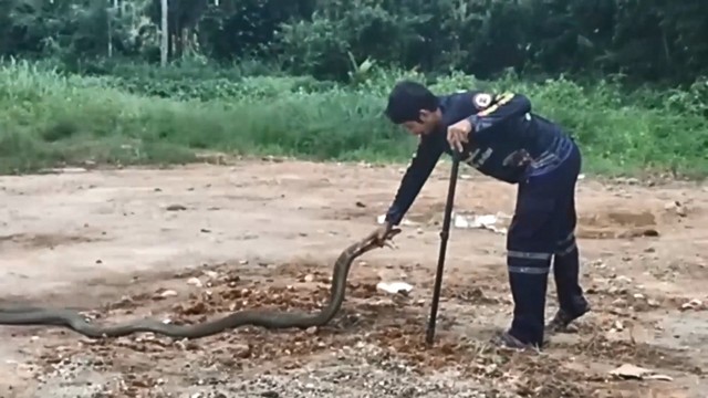 วันนี้ฯ ขณะที่ นายทวีศักดิ์ บุญเศษ เจ้าหน้าที่ทีมปราบอสรพิษอาสาพิทักษ์งู จ.สงขลา และ กู้ชีพ อบต.สะท้อน กำลังปฎิบัติหน้าที่อยู่ในพื้นที่ อ.นาทวี จ.สงขลา ก้ได้รับแจ้งจากนาย นราธิป มโนเรศน์ อายุ 37 ปี อยู่ ลานปาล์ม นาทวีสาขา 2 เลขที่ 44/7 ม.2 ต.ทับช้าง อ.นาทวี จ.สงขลา ว่ามีงูจงอางยักษ์ ขดตัวอยู่ข้างเปลที่คนงานกำลังนอนเล่นโทรศัพท์ คนงานเล่าว่าได้ยินเสียงดังแกรกๆเลยหันไปดูก็พบงูจงอางยักษ์ ด้วยความตกใจรีบกระโดดออกจากเปลวิ่งหลบไป ส่วนงูก็ได้เลื้อยเข้าไปแอบในห้องน้ำเก่า