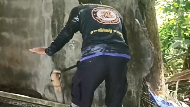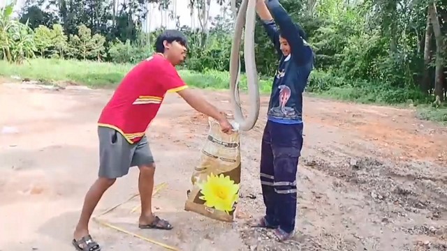 เจ้าหน้าที่ต้องใช้ความระมัดระวังในการจับซึ่งต่อมา เจ้าหน้าที่สามารถจับหางงูจงอางยักษ์ไว้ได้รีบลากออกมาที่โล่ง ก่อนใช้มือเปล่า จับหัวงูจงอางยักษ์ไว้ได้ นำมาวัดได้ยาว 4.03 เมตร จึงรีบนำใส่กระสอบ เตรียมนำไปปล่อยคืนสู่ป่าธรรมชาติต่อไป แน่นอนชาวบ้านที่มายืนดูต่างนำเอ่บ้านเลขที่มาเป็นเลขเด็ดสลากกินแบ่งรัฐบาลงวดนี้ คือเลข 447 472