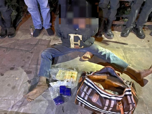 จนกระทั่งเวลา 20.20 น. เจ้าหน้าที่ตรวจพบชายต้องสงสัย อายุราว 35-40 ปี กำลังนั่งอยู่ริมทางใกล้เพิงพัก โดยมีกระเป๋าใบใหญ่ 1 ใบตั้งอยู่ข้างตัว ลักษณะมีพิรุธคล้ายผู้เสพยาเสพติดหรือพกพาสิ่งผิดกฎหมาย เจ้าหน้าที่จึงเข้าควบคุมสถานการณ์ แต่เมื่อชายคนดังกล่าวเห็นว่าเป็นเจ้าหน้าที่ตำรวจ ได้พยายามวิ่งหนีอย่างรวดเร็ว แต่ถูกสกัดจับได้ในทันที