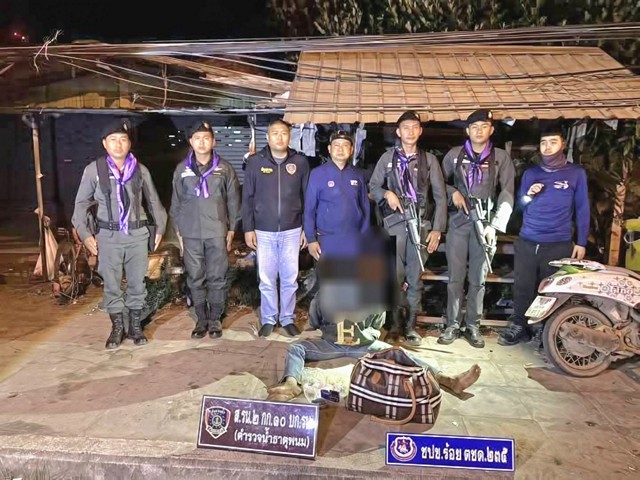 จนกระทั่งเวลา 20.20 น. เจ้าหน้าที่ตรวจพบชายต้องสงสัย อายุราว 35-40 ปี กำลังนั่งอยู่ริมทางใกล้เพิงพัก โดยมีกระเป๋าใบใหญ่ 1 ใบตั้งอยู่ข้างตัว ลักษณะมีพิรุธคล้ายผู้เสพยาเสพติดหรือพกพาสิ่งผิดกฎหมาย เจ้าหน้าที่จึงเข้าควบคุมสถานการณ์ แต่เมื่อชายคนดังกล่าวเห็นว่าเป็นเจ้าหน้าที่ตำรวจ ได้พยายามวิ่งหนีอย่างรวดเร็ว แต่ถูกสกัดจับได้ในทันที