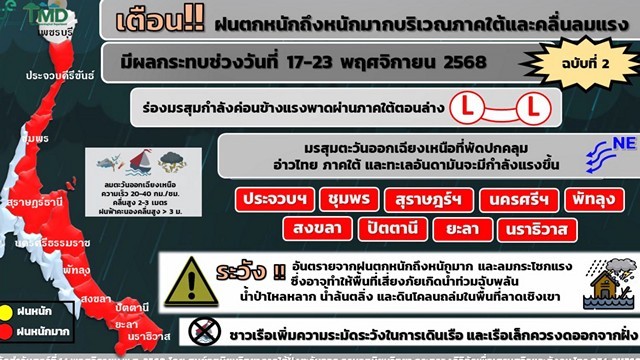 วันนี้ (16 พ.ย.68) ศูนย์อุตุนิยมวิทยาภาคใต้ฝั่งตะวันออก ประกาศฉบับที่ 2 (60/2568) เรื่อง ฝนตกหนักถึงหนักมากบริเวณภาคใต้ฝั่งตะวันออกและคลื่นลมแรงบริเวณอ่าวไทย (มีผลกระทบในช่วงวันที่ 17-23 พฤศจิกายน 2568)