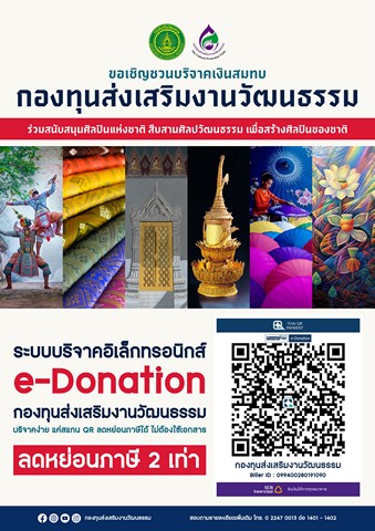 🟢 ท้ายที่สุดนี้ นางนวลพรรณ ล่ำซำ ประธานกรรมการกองทุนส่งเสริมงานวัฒนธรรม อยากจะขอเชิญชวนทุกท่าน ร่วมเป็นส่วนหนึ่งในการสนับสนุนการดำเนินงานด้านวัฒนธรรม สนับสนุนศิลปินแห่งชาติ สืบสานศิลปวัฒนธรรมของชาต โดยการบริจาคเงินสมทบผ่านกองทุนส่งเสริมงานวัฒนธรรม สามารถบริจาคง่าย ๆ ด้วยตนเอง เพียงสแกน QR Code โอนผ่านบัญชีธนาคารไทยพาณิชย์ สาขาถนนรัชดาภิเษก ชื่อบัญชี กองทุนส่งเสริมงานวัฒนธรรม เลขที่บัญชี 060-216511-7 หรือสามารถบริจาคด้วยตนเอง โดยเช็คสั่งจ่ายในนามกองทุนส่งเสริมงานวัฒนธรรม นอกจากท่านจะเป็นผู้ร่วมสืบสานศิลปวัฒนธรรมของชาติแล้ว ท่านยังสามารถลดหย่อนภาษีได้ 2 เท่า อีกด้วย