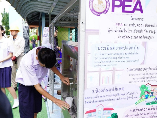 การไฟฟ้าส่วนภูมิภาค (PEA) ดำเนินโครงการ PEA ยกระดับความปลอดภัยตู้ทำน้ำดื่มในโรงเรียนสังกัด สพฐ. เพื่อเสริมสร้างความปลอดภัยให้แก่นักเรียน ครู และบุคลากรทางการศึกษา โดยมุ่งปรับปรุงและตรวจสอบระบบไฟฟ้าตู้ทำน้ำดื่มให้ได้มาตรฐานเเละมีความปลอดภัย และในปี 2568 การไฟฟ้าส่วนภูมิภาค เขต 1 (ภาคกลาง) จังหวัดพระนครศรีอยุธยา มีเป้าหมายดำเนินโครงการฯ ในพื้นที่จังหวัดพระนครศรีอยุธยา จำนวน 198 แห่ง โดยมีการติดตั้งอุปกรณ์ตัดไฟรั่วอัตโนมัติ (RCD) 335 จุด และติดตั้งสายดิน 192 จุด เป็นงบประมาณทั้งสิ้น 1,404,400 บาท
