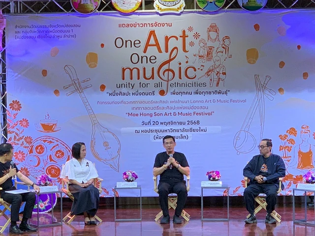 วันที่ 20 พฤศจิกายน 2568 นายวิบูรณ์ แววบัณฑิต ผู้ว่าราชการจังหวัดแม่ฮ่องสอน พร้อมด้วย นางกรวรรณ สุ่มมาตย์ วัฒนธรรมจังหวัดเชียงใหม่ อาจารย์ภานุทัต อภิชนาธง (ครูแอ๊ด เดอะสะล้อ) ศิลปินจังหวัดลำพูน และนายอนุวัตร์ แสงเจริญกูล ศิลปินจังหวัดลำปาง ร่วมแถลงข่าวเตรียมการจัดงาน “One art, One music – Unity for all Ethnicities หนึ่งศิลปะ หนึ่งดนตรี เพื่อทุกคน เพื่อทุกชาติพันธุ์” จัดโดยสำนักงานวัฒธรรมจังหวัดแม่ฮ่องสอน ร่วมกับ กลุ่มจังหวัดภาคเหนือตอนบน 1 (แม่ฮ่องสอน เชียงใหม่ ลำพูน ลำปาง) ที่ ห้องประชุมเล็ก หอประชุมมหาวิทยาลัยเชียงใหม่ จังหวัดเชียงใหม่