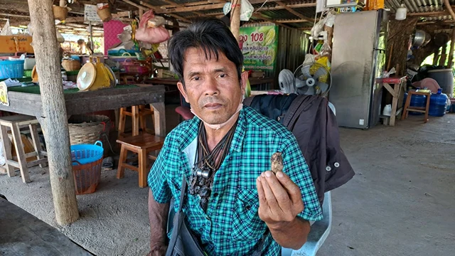 ผู้สื่อข่าวจึงได้เดินทางไป บริเวณร้านขายผลไม้ซึ่งเป็นซุ้มมุงหลังด้วยผ้ากันสาดเปิดโล่ง ตั้งอยู่ริมถนน หมู่ที่ 9 ต.แม่พูล อ.ลับแล จ.อุตรดิตถ์ ก่อนถึงตลาดกลางผลไม้สินค้าโอทอปเทศบาลหัวดง ซึ่งได้พบกับนายชัยมงคล สว่างกิจ อายุ 60 ปี หรือคุณป้อม ขณะกำลังนั่งขายผลไม่อยู่ ในคอพบว่าคุณป้อมได้แขวนหินสีดำทึบ ลักษณะคล้ายแร่เหล็กไหล หลายก้อน