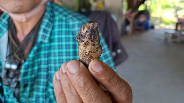 ผู้สื่อข่าวจึงได้สอบถามถึงหินที่มีลักษณะแปลกที่แขวนอยู่ภายในคอ ซึ่งก่อนที่คุณป้อมจะได้อธิบายถึงหินต่างๆคุณป้อมได้มีการจุดธูปอัญเชิญ นำหินที่มีความแปลกซึ่งมีที่มาที่ชวนอัศจรรย์นำมาให้ผู้สื่อข่าวได้ดู ซึ่งเป็นต้นกำเกิดก่อนจะได้หินแร่ต่างๆมา เมื่อได้นำลงมาจากหิ้งให้ผู้สื่อข่าวได้ดู โดยหินลักษณะดังกล่าวมี ขนาดความกว้างประมาณ 1 นิ้ว ลักษณะคล้ายเหล็กแร่ โดยคุณป้อมได้เรียกว่า”พระงั้ง ทองคำ”ด้วยสาเหตุที่ว่า บนหัวของหินมีลักษณะคล้ายหัวนก แต่บริเวณลำตัวคล้ายกับหอย เลยเรียกว่าพระงั้ง สีคล้ายสีทองปนดำ มีลักษณะที่แปลก