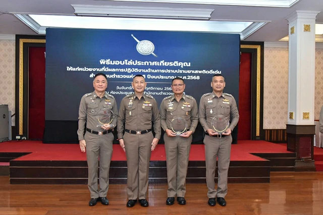 วันนี้ (24 พฤศจิกายน 2568) พล.ต.อ.กิตติ์รัฐ พันธุ์เพ็ชร์ ผู้บัญชาการตำรวจแห่งชาติ (ผบ.ตร.) เป็นประธานมอบโล่ประกาศเกียรติคุณให้แก่หน่วยงานที่มีผลการปฏิบัติงานด้านการปราบปรามยาเสพติดดีเด่น ของสำนักงานตำรวจแห่งชาติ ประจำปีงบประมาณ พ.ศ.2568 โดยมีหน่วยงานระดับกองบัญชาการถึงสถานีตำรวจได้รับรางวัล 15 รางวัล พิจารณาผลงานเป็นที่ประจักษ์ตามหลักเกณฑ์ที่ศูนย์อำนวยการป้องกันและปราบปรามยาเสพติด สำนักงานตำรวจแห่งชาติ (ศอ.ปส.ตร.) ณ ห้องสารสิน อาคาร 1 สำนักงานตำรวจแห่งชาติ