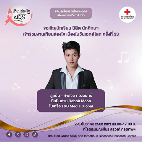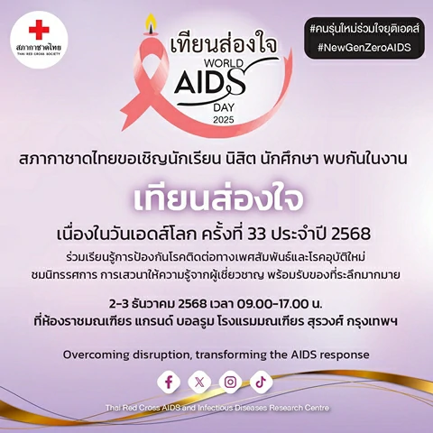 สภากาชาดไทย นำโดย ศูนย์วิจัยโรคเอดส์และโรคติดเชื้อ ร่วมกับภาคีเครือข่าย ขอเชิญเยาวชน นักเรียน นิสิต นักศึกษา ที่มีอายุไม่เกิน 30 ปี เข้าร่วมงานเทียนส่องใจ เนื่องในวันเอดส์โลก ครั้งที่ 33 ประจำปี 2568 ระหว่างวันที่ 2-3 ธันวาคม 2568 เวลา 09.00-17.00 น. ที่ห้องราชมณเฑียร แกรนด์ บอลรูม โรงแรมมณเฑียร สุรวงศ์ กรุงเทพฯ ภายใต้แนวคิด “คนรุ่นใหม่ร่วมใจยุติเอดส์ : New Gen Zero AIDS” ร่วมเรียนรู้การป้องกันโรคติดต่อทางเพศสัมพันธ์และโรคอุบัติใหม่ ชมนิทรรศการ การเสวนาให้ความรู้จากผู้เชี่ยวชาญ รับของที่ระลึกมากมาย และรับเกียรติบัตร สามารถลงทะเบียนผ่านแอปพลิเคชัน “อาสาสมัครกาชาด” ไปที่ “งานทั่วไป” เลือก “กิจกรรมเทียนส่องใจ เนื่องในวันเอดส์โลก ครั้งที่ 33” แล้วเลือก “จอง” ติดต่อสอบถามคุณสายทอง ศรีภิญโญ โทร. 08 9111 7780 สำนักงานยุวกาชาดและอาสาสมัครกาชาด สภากาชาดไทย หรือ walk in สอบถามได้ที่เฟซบุ๊กเพจ คลินิกนิรนาม ศูนย์วิจัยโรคเอดส์และโรคติดเชื้อ สภากาชาดไทย