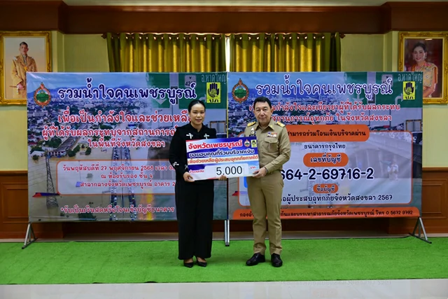 โดยภายในงาน ผู้ว่าราชการจังหวัดเพชรบูรณ์ รองผู้ว่าราชการจังหวัด และหัวหน้าส่วนราชการ ข้าราชการ ภาคธุรกิจ องค์กรปกครองส่วนท้องถิ่น และประชาชน ได้ร่วมกันบริจาคเงินช่วยเหลือผู้ประสบอุทกภัย โดยมียอดบริจาคในเช้านี้ ทั้งสิ้น 324,699 บาท ซึ่งจะถูกส่งต่อไปช่วยเหลือผู้ประสบภัยในจังหวัดสงขลาโดยตรง สำหรับประชาชนและผู้ที่สนใจบริจาคสามารถร่วมเป็นส่วนหนึ่งในการช่วยเหลือผู้ประสบภัยครั้งนี้ โดยบริจาคเพิ่มเติมได้ผ่านบัญชี ธนาคารกรุงไทย เลขที่ 664-2-69716-2 ชื่อบัญชี “ช่วยเหลือผู้ประสบอุทกภัยจังหวัดสงขลา 2567” ซึ่งเป็นบัญชีของจังหวัดสงขลาที่เปิดเพื่อรับบริจาคช่วยเหลือผู้ประสบอุทกภัยโดยตรง เพื่อส่งต่อความห่วงใยไปยังพี่น้องชาวสงขลาที่กำลังรอการช่วยเหลือในขณะนี้