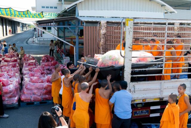 บรรยากาศ ณ จุดรวมการลำเลียงสิ่งของ มีพระสงฆ์ สามเณร คณะศิษย์วัด และเยาวชนอาสา ร่วมกันลำเลียงสิ่งของขึ้นรถคาราวาน ก่อนปล่อยขบวนความช่วยเหลือออกจากวัดพระธรรมกาย สิ่งของทั้งหมดมาจากการบริจาคของประชาชน ประกอบด้วยถุงยังชีพ 3,000 ชุด เรือช่วยเหลือ 8 ลำ เสื้อชูชีพ 100 ตัว เสื้อผ้าและของใช้จำเป็น รวมถึงน้ำดื่ม 500 มล. 1,000 ขวด โดยถุงยังชีพหนึ่งชุดบรรจุอาหารพร้อมบริโภค ข้าวสาร ปลากระป๋อง บะหมี่กึ่งสำเร็จรูป อาหารแห้ง และขนม เพื่อช่วยบรรเทาความเดือดร้อนของผู้ประสบภัยใน 6 จังหวัดภาคใต้ ได้แก่ จังหวัดสงขลา ปัตตานี พัทลุง สตูล ยะลา และนราธิวาส