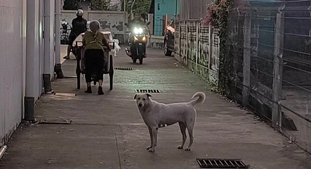 ที่บริเวณหน้าร้านสะดวกซื้อ ถนนไชยพันธ์ ตำบลนครนายก อำเภอเมือง จังหวัดนครนายก ผู้สื่อข่าวได้รับแจ้งจากแม่ค้าขายเครปว่ามีหมาจรเพศเมียสีขาวอายุประมาณ 4 ปี จะมานอนอยู่บริเวณหน้าร้านสะดวกซื้อทุกวันเป็นหมาจรแสนรู้ มีชาวบ้านเอ็นดูได้นำอาหารมาว่างให้อยู่เป็นประจำและช่วงที่เด็กนักเรียนเลิกเรียนพิเศษก็จะมารอวิ่งไปส่งนักเรียนถึงโรงพักเป็นประจำทุกวัน ผู้สื่อข่าวได้ไปสังเกตุการณ์ดูได้ประมาณ 4 วันพบว่าเจ้าขาวหมาจรตัวนี้จะนอนอยู่หน้าประตูทางเข้าร้านสะดวกซื้ออยู่เป็นประจำ