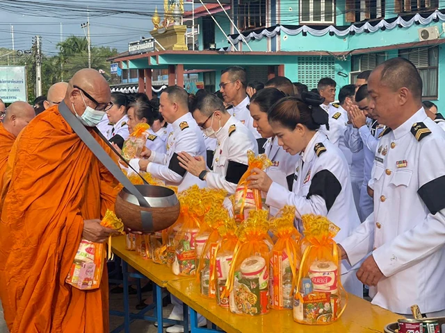 พลเรือตรี กิติศักดิ์ สายนุช ผู้อำนวยการโรงพยาบาลสมเด็จพระนางเจ้าสิริกิติ์ กรมแพทย์ทหารเรือ มอบหมายให้ นาวาเอกกฤชทอง แท่งทอง หัวหน้ากลุ่มงานห้องตรวจโรคประกันสังคมและผู้ป่วยทั่วไป โรงพยาบาลสมเด็จพระนางเจ้าสิริกิติ์ฯ เป็นผู้แทน พร้อมด้วยกำลังพล เข้าร่วมพิธีตักบาตรข้าวสารอาหารแห้ง และพิธีวางพานพุ่มดอกไม้ เนื่องในวันคล้ายวันพระบรมราชสมภพ พระบาทสมเด็จพระบรมชนกาธิเบศร มหาภูมิพลอดุลยเดชมหาราช บรมนาถบพิตร วันชาติ และวันพ่อแห่งชาติ 5 ธันวาคม 2568 ณ ศาลาประชาคม ที่ว่าการอำเภอสัตหีบ จ.ชลบุรี