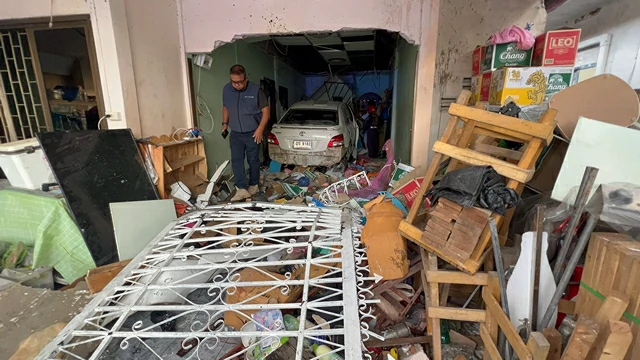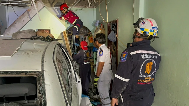 ชลบุรี-หนุ่มควบเก๋งชนรั้ว พุ่งทะลุเข้าบ้าน ชนอัดกำแพง เจ้าของบ้านถูกกำแพงถล่มทับเจ็บคาห้องน้ำ