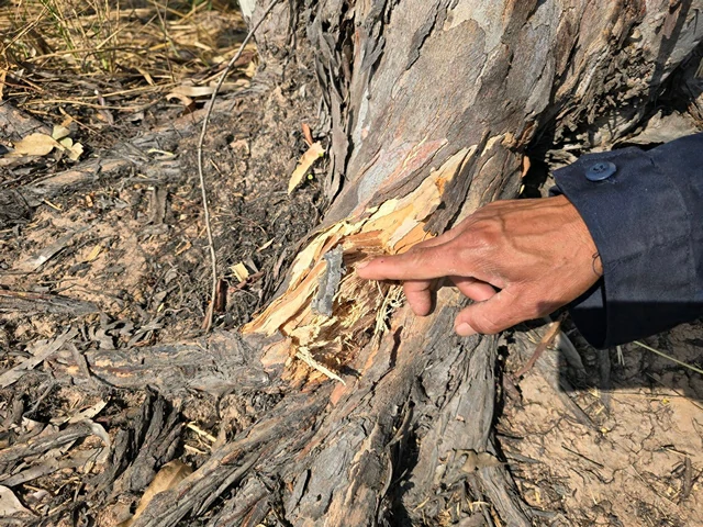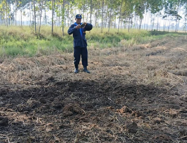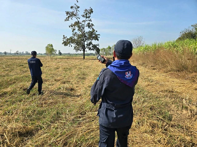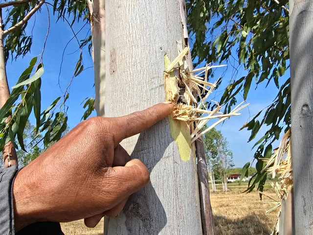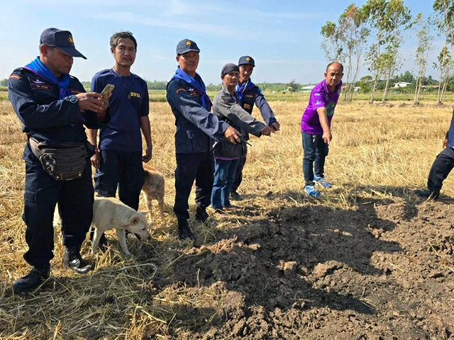 ผู้สื่อข่าวลงพื้นที่ตรวจสอบที่บ้านหว้า หมู่ 7 ต.เขาดินเหนือ อ.บ้านกรวด จุดที่ผู้นำแจ้งว่ามีลูกจรวดตกในพื้นที่ จากการตรวจสอบพบบริเวณที่นาของชาวบ้านเป็นหลุมดินขนาดใหญ่ พบสะเก็ดระเบิดกระเด็นไปโดนต้นไม้บริเวณโดยรอบอย่างเห็นได้ชัด