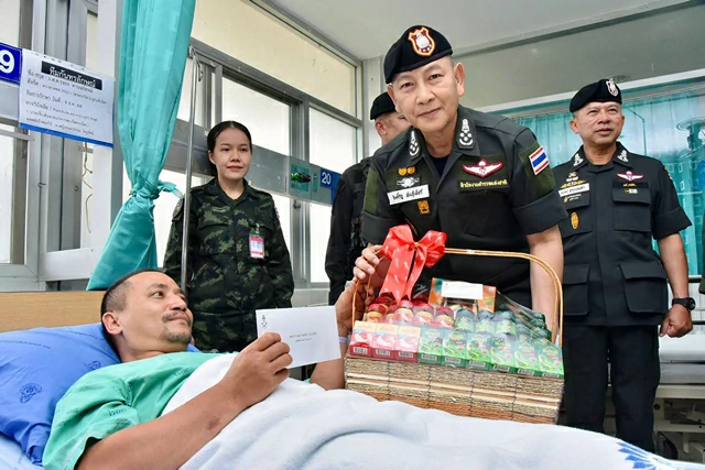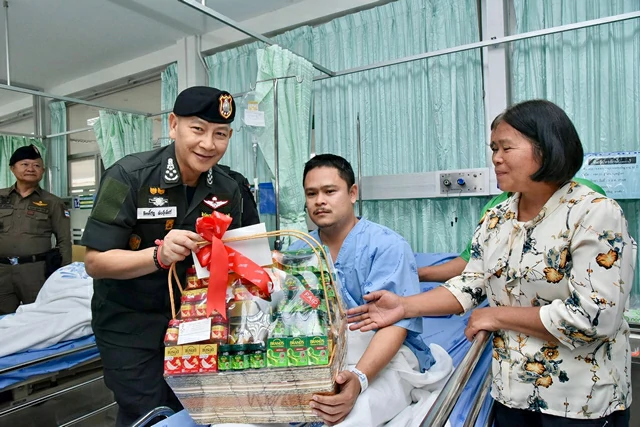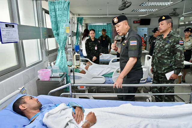 จากนั้น ผบ.ตร. เดินทางไปเยี่ยม ตชด. และทหารที่ได้รับบาดเจ็บ ซึ่งรักษาตัวที่ รพ.สรรพสิทธิประสงค์ จ.อุบลราชธานี โดย ผบ.ตร. กล่าวว่า ทราบว่ามีน้อง ๆ ทหาร และตำรวจตระเวนชายแดนได้รับบาดเจ็บ โดยตำรวจบาดเจ็บ 6 มี 3 นายที่ยังรักษาตัวที่ รพ. สรรพสิทธิประสงค์ อีก 3 นายกลับไปที่ตั้ง โดย 2 ใน 3 นายขอกลับไปพื้นที่แนวหน้าอีก ส่วนน้อง ๆ ทหารถือโอกาสมาเยี่ยมด้วย โดยนายอนุทิน ชาญวีรกูล นายกรัฐมนตรี โทรมาฝากเยี่ยม ฝากความห่วงใย ให้กำลังใจตำรวจและทหารที่ได้รับบาดเจ็บด้วย อย่างไรก็ตามขอเป็นกำลังใจให้ทหาร และตำรวจที่ร่วมรักษาแผ่นดินไทย ไม่ว่าอย่างไรหน้าที่ของเราทั้งตำรวจ ทหาร คือการรักษาอธิปไตย และที่สำคัญต้องดูแลประชาชนให้ปลอดภัยด้วย