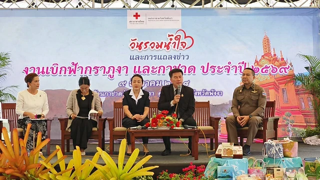 ในเวลาต่อมา นายไพรัตน์ เพชรยวน ผู้ว่าราชการจังหวัดพังงา นางสรัญญา เพชรยวน นายกเหล่ากาชาดจังหวัดพังงา พล.ต.ต. ชัยเกียรติ วิริยสถิตย์กุล ผบก. ภ. จว.พังงา และนางสาวกัลยรักษ์ เพชรอาวุธ พาณิชย์จังหวัดพังงา ร่วมแถลงถึงความพร้อมในการจัด “งานเบิกฟ้ากราภูงา และกาชาด ประจำปี 2569” โดยมีนายบัญชา ธนูอินทร์ รองผู้ว่าราชการจังหวัดพังงา นายสราวุฒิ ธนาเจริญสกุล รองผู้ว่าราชการจังหวัดพังงา ส่วนราชการ รัฐวิสาหกิจ องค์กรปกครองส่วนท้องถิ่น คณะกรรมการ ที่ปรึกษา สมาชิกเหล่ากาชาดจังหวัดพังงา ภาคเอกชน และสื่อมวลชน เข้าร่วม