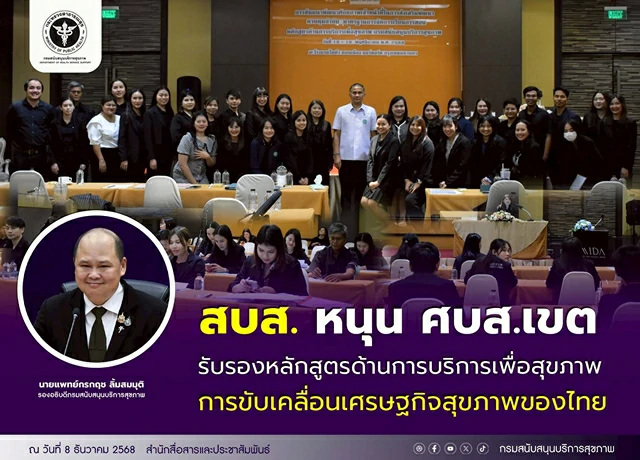 กรมสนับสนุนบริการสุขภาพ (สบส.) กระทรวงสาธารณสุข เดินหน้าพัฒนาเจ้าหน้าที่ประจำศูนย์สนับสนุนบริการสุขภาพ (ศบส.) 12 เขตทั่วประเทศ เป็นผู้รับรองหลักสูตรด้านการบริการเพื่อสุขภาพ ลดขั้นตอนการอนุมัติ เพิ่มความรวดเร็วในการพิจารณารับรองหลักสูตรที่สอดคล้องกับความต้องการของตลาดสุขภาพยุคใหม่ รองรับการขับเคลื่อนเศรษฐกิจสุขภาพ (Health Economy) ของประเทศอย่างยั่งยืน