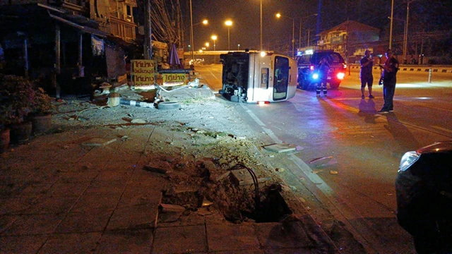 ชลบุรี-หนุ่มซิ่งรถตู้ชนเสาไฟขาดท่อน อาละวาดกลางถนนบางเสร่ ตำรวจคุมตัววุ่น