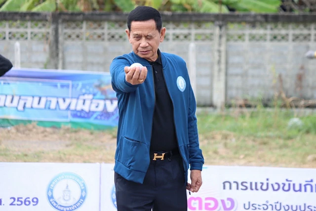 นาวาเอกอนุศักดิ์ นาคทิม นายกเทศมนตรีตำบลบางเมือง ประธานเปิดกิจกรรม ภายใต้โครงการ การแข่งขันกีฬาเปตอง ประจำปีงบประมาณ 2569 ณ ลานจอดรถโรงเรียนอนุบาลเทศบาลบางเมือง