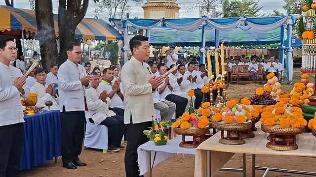 จากนั้นทุกภาคส่วนได้ร่วมกันฟังพระภิกษุสวดเจริญพุทธมนต์ พร้อมถวายอาหารเพลแด่พระภิกษุ พร้อมกันนี้ พระภิกษุได้มีการปะพรมน้ำมนต์ ให้แก่ผู้มาร่วมพิธีในครั้งนี้เพื่อความเป็นสิมงคลแก่ชีวิตอีกด้วย
