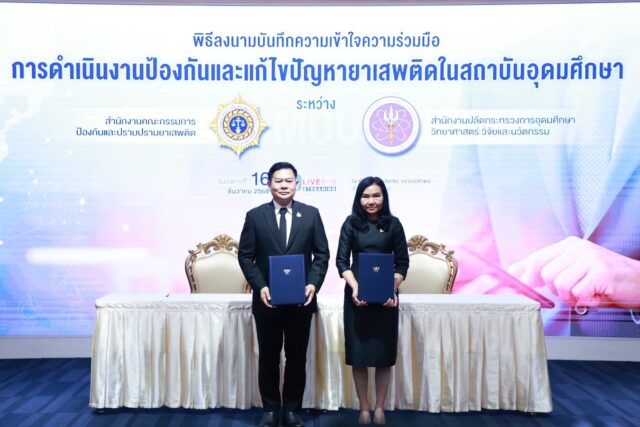 สำนักงาน ป.ป.ส. ผนึกกระทรวงการอุดมศึกษา วิทยาศาสตร์ วิจัยและนวัตกรรม (อว.) ลงนาม MOU ขับเคลื่อนการป้องกันและแก้ไขปัญหายาเสพติดในสถาบันอุดมศึกษาทั่วประเทศ มุ่งสร้างภูมิคุ้มกันในกลุ่มนิสิตนักศึกษา พร้อมยกระดับการเรียนการสอน ผลิตบุคลากรคุณภาพรับมือปัญหายาเสพติดอย่างเป็นระบบ
