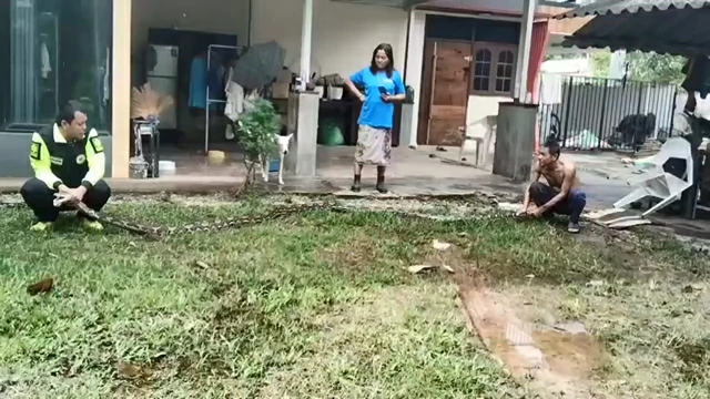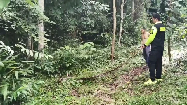 เมื่อเจ้าหน้าที่ฯไปถึงพบงูเหลือมยักษ์นอนขดตัวอยู่ป่าหญ้าหลังบ้าน จึงเข้าทำการจับงูเหลือมทันทีโดยใช้เวลานานประมาณ 2 นาที ก็สามารถจับงูเหลือมยักษ์นำมาวัดได้ความยาว 6 เมตร จึงนำใส่กระสอบเตรียมนำไปปล่อยคืนสู่ป่าธรรมชาติที่อยู่ห่างไกลบ้านเรือนผู้คนต่อไปเพื่อความปลอดภัย