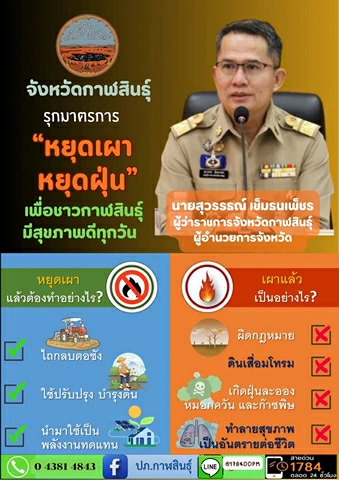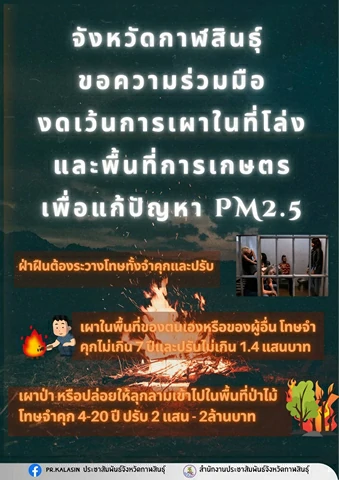 นอกจากนี้ ยังกำชับให้นายอำเภอทุกอำเภอ เร่งสร้างการรับรู้ให้ประชาชนเข้าใจสถานการณ์และตระหนักถึงผลกระทบจากการทำกิจกรรมที่ก่อให้เกิดฝุ่นละอองขนาดเล็ก รวมถึงบทลงโทษตามกฎหมายที่เกี่ยวข้อง โดยจังหวัดกาฬสินธุ์ จะดำเนินการจัดกิจรรม Kick off ‘หยุดเผา-หยุดฝุ่น-เพื่อคุณ-เพื่อเรา’ ในวันที่ 25 ธ.ค. 2568 เวลา 09.00 น. ที่บริเวณศาลากลางบ้านขมิ้น หมู่ที่ 1 ตำบลขมิ้น อำเภอเมืองจังหวัดกาฬสินธุ์