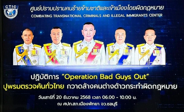 วันนี้ (20 ธันวาคม 2568) พล.ต.อ.สำราญ นวลมา รองผู้บัญชาการตำรวจแห่งชาติ (รอง ผบ.ตร.) ในฐานะผู้อำนวยการศูนย์ปราบปรามคนร้ายข้ามชาติและเข้าเมืองโดยผิดกฎหมาย สำนักงานตำรวจแห่งชาติ (ผอ.ศปชก.ตร.) ได้รับมอบหมายจาก พล.ต.อ.กิตติ์รัฐ พันธุ์เพ็ชร์ ผบ.ตร. ให้ดูแลการยกระดับมาตรการเชิงป้องกันในการรักษาความปลอดภัยพื้นที่ส่วนหลัง เพื่อป้องกันและสกัดกั้นภัยคุกคามที่อาจส่งผลกระทบต่อความสงบเรียบร้อย และความมั่นคงของประเทศ วันนี้ได้เดินทางไปยังศูนย์ปฏิบัติการ สภ.เมืองพัทยา จ.ชลบุรี ประชุมร่วมกับ พล.ต.ท.ภาณุมาศ บุญลักษณ์ ผู้บัญชาการสำนักงานตรวจคนเข้าเมือง (ผบช.สตม.), พล.ต.ต.พันธนะ นุชนาถ รอง ผบช.สตม. และผู้เกี่ยวข้อง และสั่งการเปิดปฏิบัติการ “Operation Bad Guys Out” ปูพรมตรวจค้นทั่วไทย กวาดล้างคนต่างด้าวกระทำผิดกฎหมาย พร้อมกันทั่วประเทศในวันนี้ เวลา 06.00 น. ต่อเนื่องปฏิบัติการระดมกวาดล้างคนต่างด้าวกระทำผิดกฎหมาย โดยสำนักงานตรวจคนเข้าเมือง เมื่อวันที่ 1-19 ธันวาคม 2568