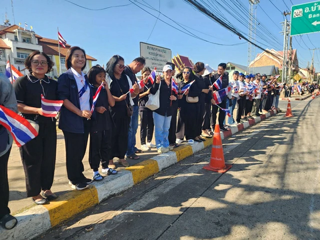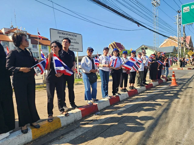 อำเภอประโคนชัย//ชาวบ้านกว่า 200 คนถือธงชาติไทยออกมายืนริมถนนเพื่อรอรับร่างจ่าเริง ทหารกล้าเนิน 350 กลับบ้าน ขณะชาวบ้านจังหวัดสุรินทร์ ตั้งใจเดินทางมาขอบคุณร่างจ่าเริง ที่เสียสละปกป้องพวกเขาให้ปลอดภัย