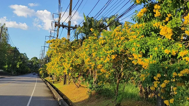 พังงา-สุดฟิน!!ทองอุไรสองฝั่งถนนเมืองประวัติศาสตร์ตะกั่วป่ายาว 7 ก.ม.ออกดอกบานสะพรั่งอวดโฉมให้นักท้องเที่ยวได้ชื่นชมความสวยงามจุใจ