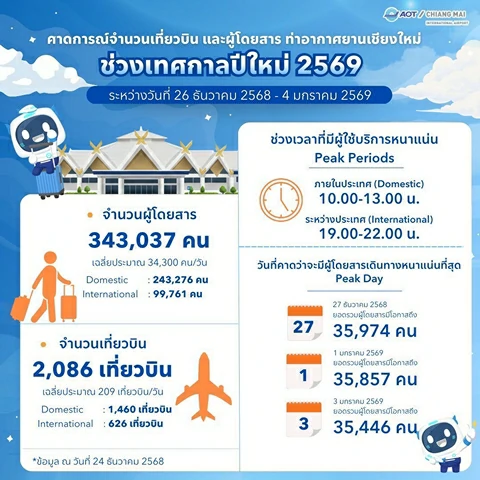 ทั้งนี้ ในช่วงเทศกาลปีใหม่ ระหว่างวันที่ 26 ธันวาคม 2568 – 4 มกราคม 2569 คาดว่าจะมีเที่ยวบินรวม 2,086 เที่ยวบิน และมีผู้โดยสารเดินทางผ่านท่าอากาศยานเชียงใหม่กว่า 343,000 คน โดยช่วงเวลาที่คาดว่าจะมีผู้โดยสารหนาแน่น ได้แก่ เวลา 10.00 – 13.00 น. สำหรับเที่ยวบินภายในประเทศ และเวลา 19.00 – 22.00 น.