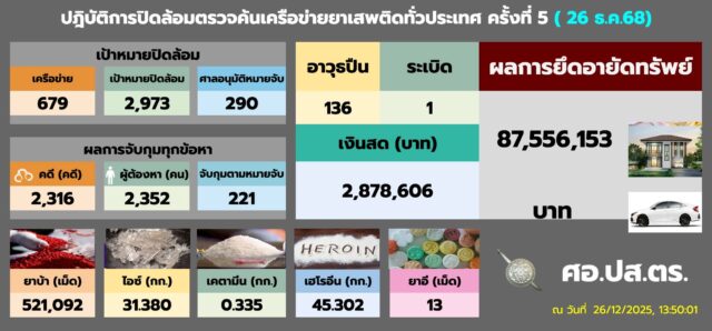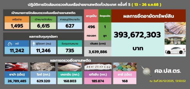 ทั้งนี้ ยอดสะสมปิดล้อมตรวจค้นเครือข่ายยาเสพติดทั่วประเทศ ครั้งที่ 5 (ห้วงวันที่ 13-26 ธันวาคม 2568) สามารถจับกุมคดียาเสพติด 11,242 คดี ได้ตัวผู้ต้องหา 11,246 คน และจับกุมผู้ต้องหาตามหมายจับค้างเก่าได้ 735 หมาย พร้อมยึดของกลาง ยาบ้า 26.78 ล้านเม็ด, ไอซ์ 629 กิโลกรัม, คีตามีน 168 กิโลกรัม, เฮโรอีน 185 กิโลกรัม, ยาอี 168 เม็ด, อาวุธปืน 496 กระบอก และระเบิด 1 ลูก และผลการยึดทรัพย์ ตรวจยึดเงินสด 3.6 ล้านบาท และอายัดทรัพย์สินที่เกี่ยวเนื่องกับการกระทำความผิดรวมมูลค่ากว่า 393 ล้านบาท