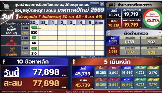 วันนี้ (31 ธันวาคม 2568) พล.ต.อ.สำราญ นวลมา รองผู้บัญชาการตำรวจแห่งชาติ ในฐานะผู้อำนวยการ ศูนย์อำนวยการป้องกันและลดอุบัติเหตุทางถนนช่วงเทศกาลปีใหม่ พ.ศ.2569 สำนักงานตำรวจแห่งชาติ และผู้อำนวยการศูนย์บริหารงานจราจร สำนักงานตำรวจแห่งชาติ เปิดเผยว่า วันนี้และวันพรุ่งนี้เป็นเทศกาลส่งท้ายปีเก่าต้อนรับปีใหม่ มีประชาชนเดินทางและร่วมกิจกรรมเฉลิมฉลองเป็นจำนวนมาก สำนักงานตำรวจแห่งชาติจึงเพิ่มความเข้มข้นในการอำนวยความสะดวกด้านการจราจร ควบคู่กับการบังคับใช้กฎหมายจราจรอย่างเคร่งครัด โดยเฉพาะความผิดฐานเมาแล้วขับ ซึ่งเป็นสาเหตุสำคัญของอุบัติเหตุร้ายแรง เพื่อป้องกันการสูญเสียต่อชีวิตและทรัพย์สินของประชาชน