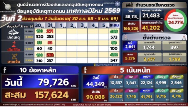 จากผลการปฏิบัติในวันที่ 31 ธันวาคม 2568 ซึ่งเป็นวันที่สองของการรณรงค์ช่วง 7 วันควบคุมเข้มข้น พบการบังคับใช้กฎหมายจราจรใน 10 ข้อหาหลัก จำนวน 79,726 ราย รวม 2 วันจำนวน 157,624 ราย สะท้อนให้เห็นถึงพฤติกรรมการใช้รถใช้ถนนที่ยังต้องเฝ้าระวังอย่างใกล้ชิด โดยเจ้าหน้าที่ตำรวจยังคงติดตามสถานการณ์อุบัติเหตุทางถนนอย่างต่อเนื่อง พร้อมเพิ่มมาตรการป้องกันและลดความเสี่ยงในจุดเสี่ยง จุดตัด และเส้นทางสายหลักที่มีปริมาณรถมาก