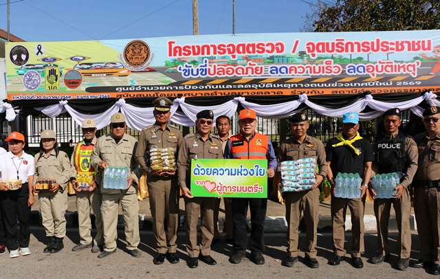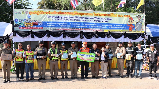 วันที่ 31 ธันวาคม 2568 ที่ศูนย์ปฏิบัติการร่วมป้องกันและลดอุบัติเหตุทางถนนในช่วงเทศกาลปีใหม่ 2569 หน้าเทศบาลตำบลบัวบาน อ.ยางตลาด จ.กาฬสินธุ์ พล.ต.ต.มนตรี จรัลพงศ์ หรือ “ผู้การมนตรี” อดีตผบก.ภ.จว.กาฬสินธุ์ ผู้ทรงคุณวุฒิด้านความปลอดภัยทางถนนสำนักงานปภ.กาฬสินธุ์ และประธานกรรมการสันนิบาตสหกรณ์ จ.กาฬสินธุ์ พร้อมคณะนำเครื่องอุปโภค บริโภค อาหาร เครื่องดื่ม ที่ได้นำเงินส่วนตัวจัดซื้อ และได้รับบริจาคจากผู้มีจิตศรัทธาเป็นสะพานบุญมอบให้กับเจ้าหน้าที่ประจำศูนย์บริการประชาชนช่วงเทศกาลปีใหม่ 2569