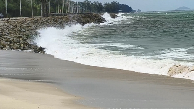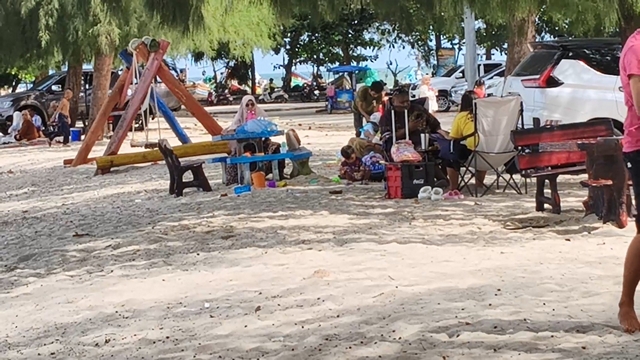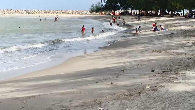 ในวันนี้สภาพอากาศร้อน บริเวณชายหาดเด็กๆลงเล่นน้ำทะเลในเวิ้งอ่าวคลายร้อนกัน เนื่องจากน้ำบริเวณนี้ไม่ลึก และไม่มีคลื่นลม มีนักท่องเที่ยวพาครอบครัวเดินทางมาท่องเที่ยวลงเล่นน้ำทะเลกันอย่างสนุกสนาน