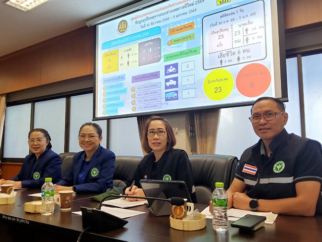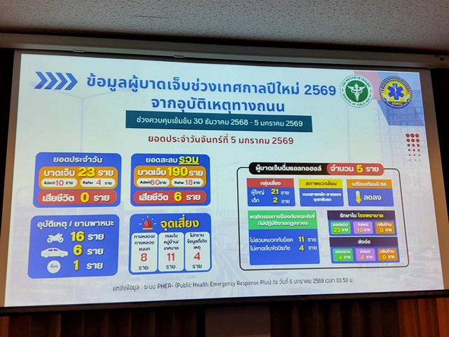 ด้านสถิติสะสม 7 วัน ระหว่างวันที่ 30 ธันวาคม 2568 – 5 มกราคม 2569 พบว่าเกิดอุบัติเหตุรวม 25 ครั้ง มีผู้บาดเจ็บ 23 คน และมีผู้เสียชีวิต 6 ราย