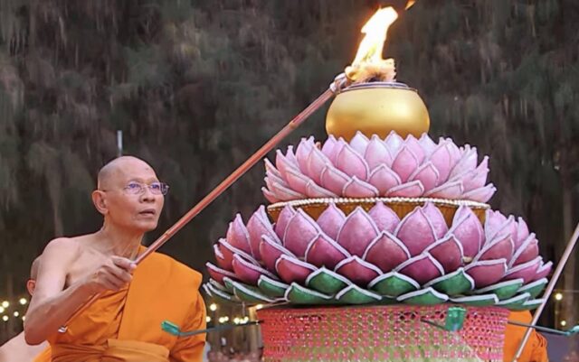 จากนั้น พระพรหมดิลก เจ้าอาวาสวัดสามพระยาวรวิหาร น้อมนำพวงมาลัยถวายบูชาพระบรมสารีริกธาตุ และรูปหล่อพระมงคลเทพมุนี (สด จนฺทสโร) พร้อมด้วย พระปริยัติวรคุณ เจ้าคณะอำเภอสองพี่น้อง เจ้าอาวาสวัดสองพี่น้อง พระอารามหลวง นำคณะสงฆ์ธรรมยาตรา 1,142 รูป และพุทธศาสนิกชนจุดประทีปถวายเป็นพุทธบูชา และบูชาธรรมพระมงคลเทพมุนี (สด จนฺทสโร) ต่อมาพระภาวนาธรรมวิเทศ แสดงพระธรรมเทศนาเรื่อง ความสำคัญของสถานที่เกิดด้วยรูปกายเนื้อ พระมงคลเทพมุนี (สด จนฺทสโร) ความตอนหนึ่งว่า “อนุสรณ์สถานบ้านเกิดพระมงคลเทพมุนี (สด จนฺทสโร) สถานที่เกิดรูปกายเนื้อของพระมงคลเทพมุนี ตั้งอยู่บนแผ่นดินรูปดอกบัว