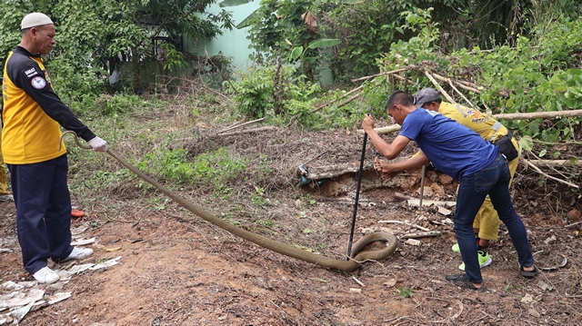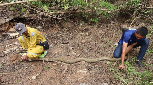 เบตง ผวา ขับรถไถปรับที่ดินเตรียมสร้างบ้าน เจองูจองอาง ยาว 4 เมตร หนัก 10 กิโลกรัม จ้องหน้าไม่หนี รีบแจ้งกู้ภัยจับปล่อยคืนสู่ป่าธรรมชาติ อีกตัวหนีไปได้