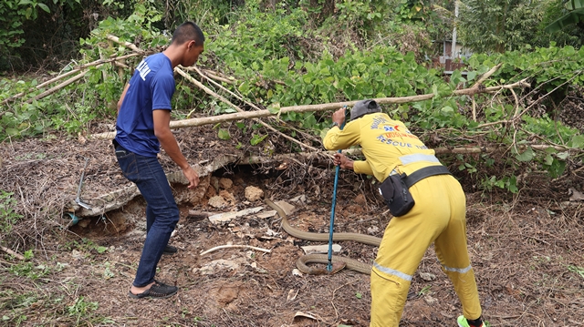 เบตง ผวา ขับรถไถปรับที่ดินเตรียมสร้างบ้าน เจองูจองอาง ยาว 4 เมตร หนัก 10 กิโลกรัม จ้องหน้าไม่หนี รีบแจ้งกู้ภัยจับปล่อยคืนสู่ป่าธรรมชาติ อีกตัวหนีไปได้