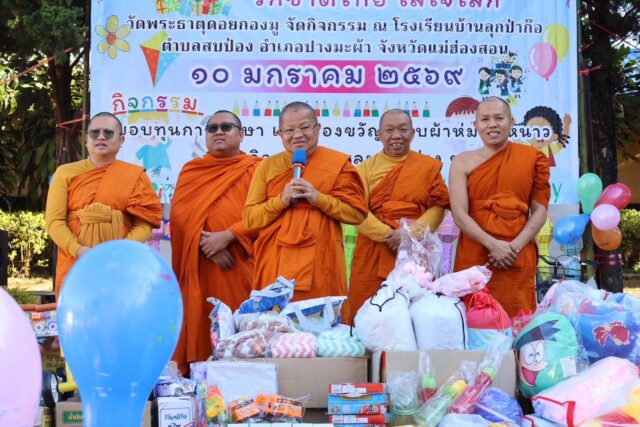 ทั้งนี้ เจ้าคณะจังหวัดแม่ฮ่องสอน ได้นำคณะศรัทธาวัดพระธาตุดอยกองมู ได้มอบทุนการศึกษา ของขวัญ ของรางวัล ขนม นม น้ำดื่ม และอาหาร จัดกิจกรรมวันเด็กแห่งชาติให้กับเด็ก และเยาวชนในพื้นที่ซึ่งอยู่ห่างไกล และเป็นเด็กชาติพันธุ์ ประกอบด้วยชาติพันธุ์กะเหรี่ยง และชาติพันธุ์ลาหู่ ที่โรงเรียนบ้านลุกป่าก๊อ ซึ่งปีนี้เป็นปีที่ 3 แล้ว
