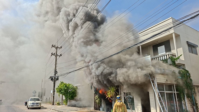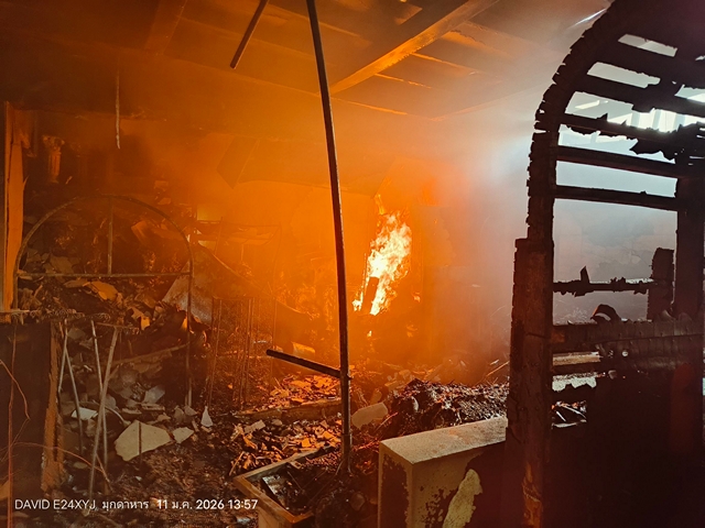 มุกดาหาร -ระทึก! ไฟไหม้ร้านดอกไม้กลางเมืองมุกดาหาร วอด 2 คูหา คาดไฟฟ้าลัดวงจรสะเก็ดไฟตกใส่กองผ้า